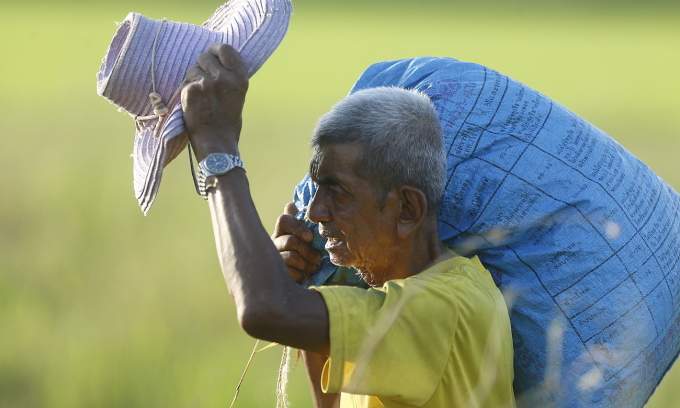 A farmer harvests in his rice field during sunrise in Nakhon Sawan province, north of Bangkok, on October 19, 2025. Photo by NurPhoto via AFP |