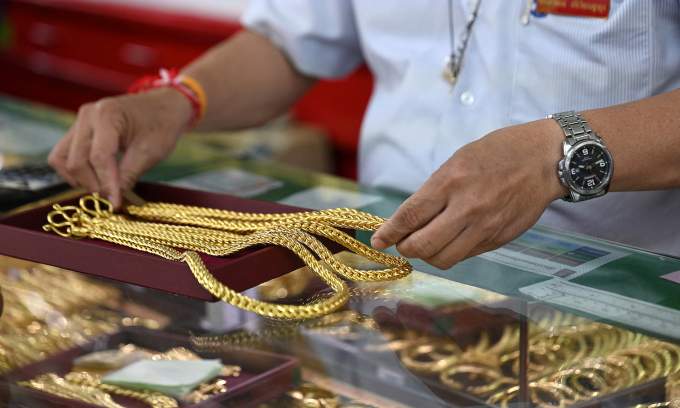 An employee handles gold jewelry for customers at Hua Seng Heng gold traders in Chinatown in Bangkok on April 9, 2025. Photo by AFP |