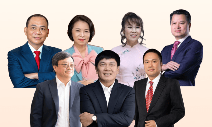 Seven of Vietnam’s 8 billionaires. From top to bottom, left to right: Vingroup chairman Pham Nhat Vuong, Vingroup vice chairwoman Pham Thu Huong, VietJet Air chairwoman Nguyen Thi Phuong Thao, VPBank chairman Ngo Chi Dung, Masan chairman Nguyen Dang Quang, Hoa Phat Group chairman Tran Dinh Long, Techcombank chairman Ho Hung Anh. Graphics by VnExpress/Trong Hieu |