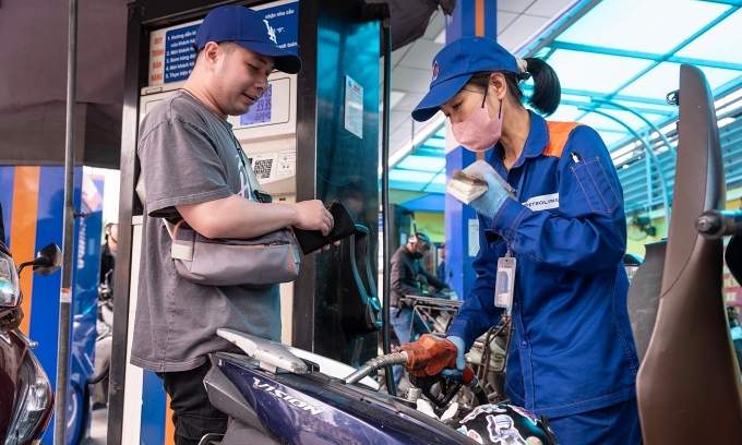 A woman fills a motorcycle’s fuel tank as the driver waits to pay at a gas station in Hanoi, March 7, 2026. Photo by VnExpress/Giang Huy |