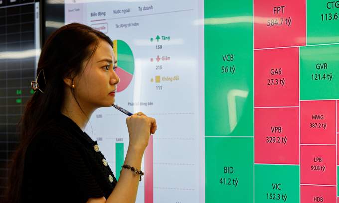 An investor looks at stock prices on the screens at a brokerage in Ho Chi Minh City. Photo by VnExpress/An Khuong