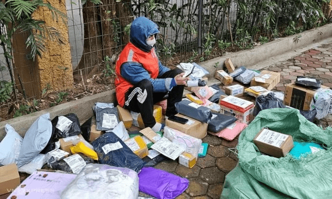 A delivery person sorts out e-commerce orders in Hanoi in January 2024. Photo by VnExpress/Phuong Dung