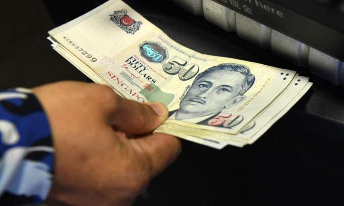 A customer withdraws Singapore dollar notes from an ATM in Singapore on April 13, 2018. Photo by AFP
